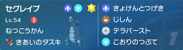 本当は【巨剣突撃+つららばり+地震】の攻撃範囲で考えてたんだけど、電気テラバーストを入れざるを得なかった。
