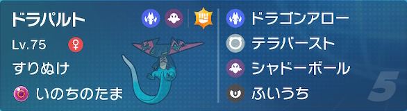 AS振りのドラパルト。珠ドラゴンアローと不意打ちで終盤の一掃を担当する。